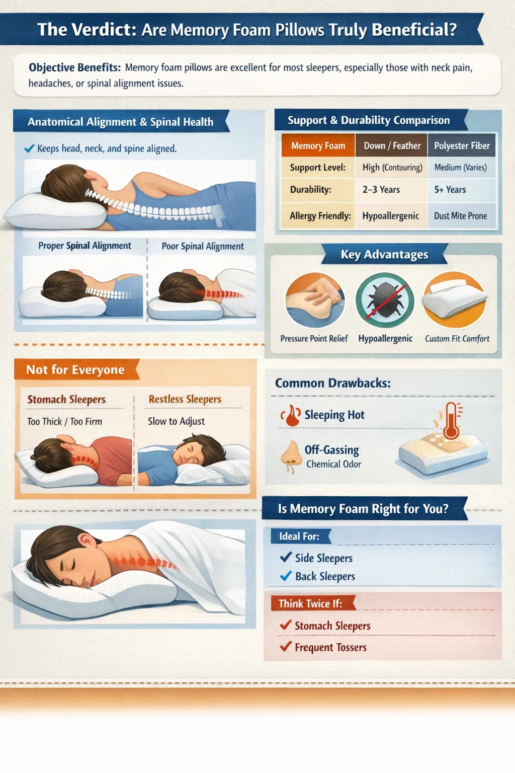 Walaupun mereka menawarkan kelebihan ortopedik yang ketara, mereka bukanlah ubat penawar sejagat. "Kebaikan" mereka bergantung pada postur tidur peribadi anda, toleransi haba, dan kepekaan terhadap bau bahan. Untuk tidur sisi atau belakang, bantal busa memori boleh menjadi a alat transformatif untuk kebersihan tidur , manakala orang yang tidur perut mungkin mendapati mereka terlalu ketat atau tegas.
