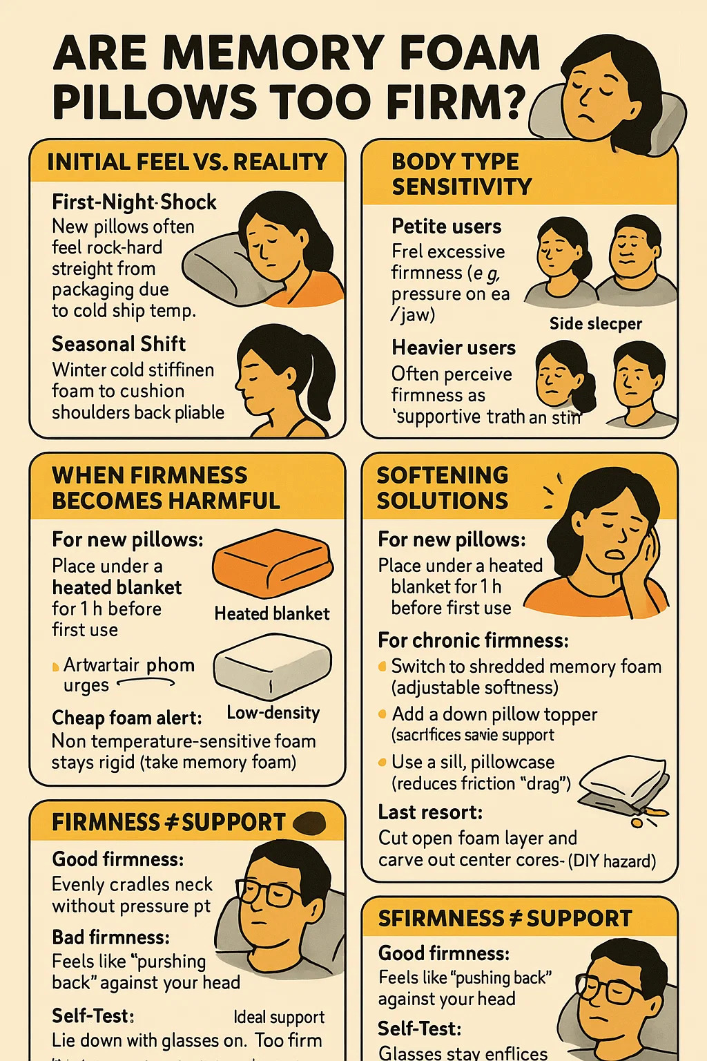 Untuk ketegasan kronik: → Tukar ke busa memori yang dicincang (kelembutan laras). → Tambah topper bantal bawah (mengorbankan beberapa sokongan). → Gunakan sarung bantal sutera (mengurangkan geseran "seret").
