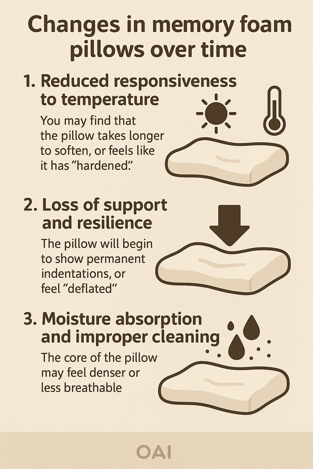 Memandangkan bantal digunakan dari semasa ke semasa, beberapa komponen yang digunakan untuk membentuk busa memori mungkin beransur-ansur menjadi tua. Ini boleh menyebabkan tindak balas yang lebih perlahan terhadap suhu badan dan suhu bilik.