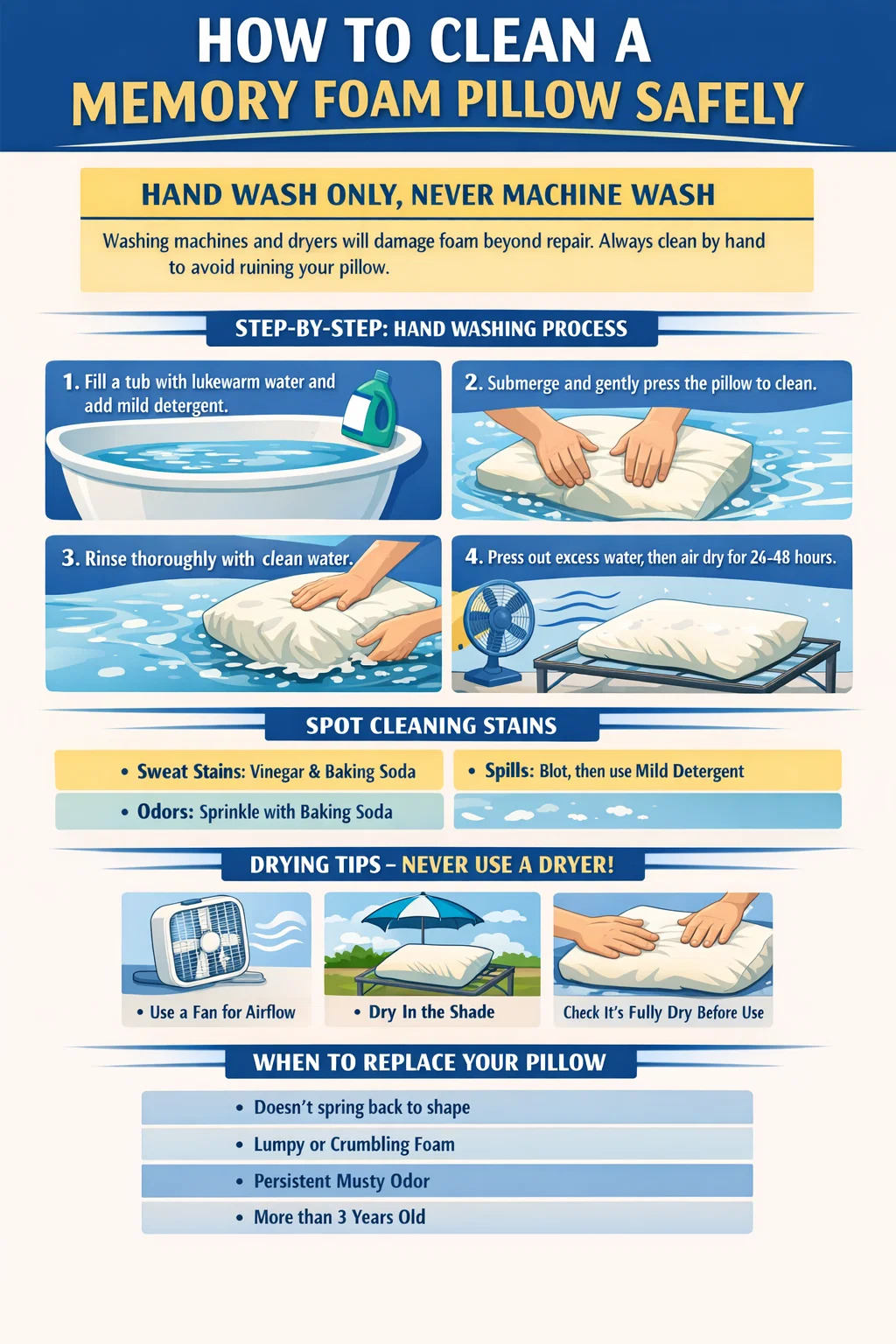 Kaedah yang betul ialah membasuh tangan dengan air suam dan sedikit detergen cecair lembut, diikuti dengan tempoh pengeringan udara yang panjang - biasanya 24 hingga 48 jam. Untuk pembersihan tempat di antara cucian penuh, campuran air dan cuka putih yang disapu dengan kain berfungsi dengan berkesan pada kebanyakan kotoran tanpa mengenyangkan buih. Panduan ini merangkumi setiap senario secara terperinci, daripada penyegaran rutin kepada pembersihan mendalam bantal busa memori yang sangat kotor.