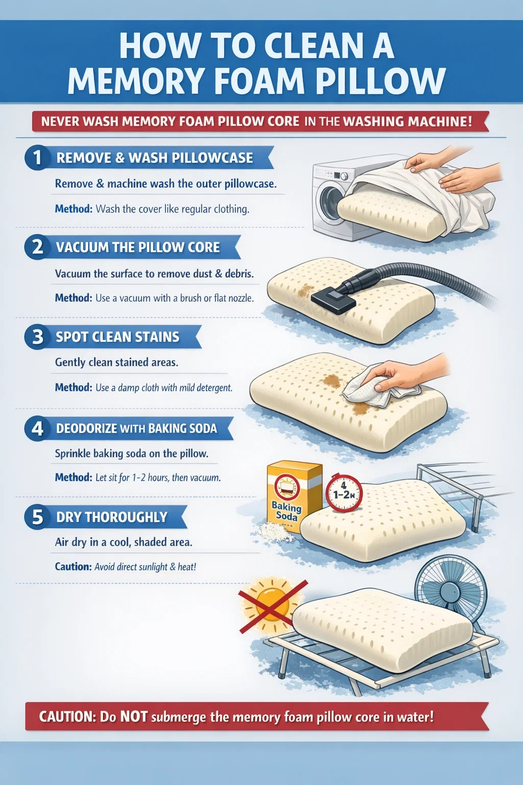 Walaupun "teras bantal" tidak boleh dicuci dengan mesin, anda boleh membersihkan bantal busa memori anda dengan selamat menggunakan langkah berikut:
