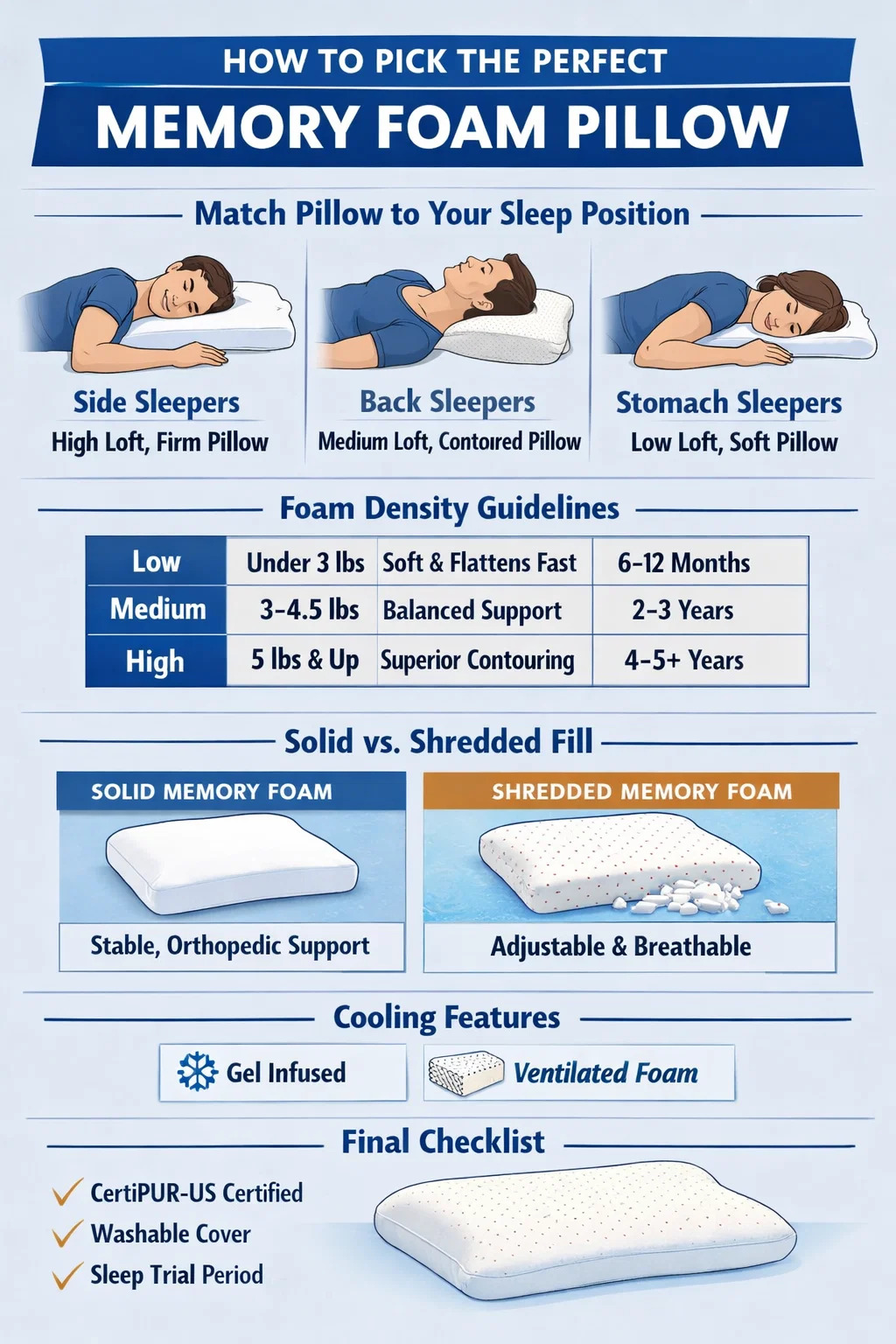 Untuk memilih yang betul bantal busa memori , anda mesti memadankan "loteng" (ketinggian) dan "ketegangan" bantal dengan posisi tidur utama anda. Tidur sisi harus memilih bantal loteng tinggi dan padat untuk mengisi celah bahu; tidur belakang memerlukan bantal loteng sederhana dengan kontur leher; dan tidur perut memerlukan buih yang sangat nipis, lembut atau isi yang dicincang. Di luar kedudukan, sentiasa semak ketumpatan buih (sasar untuk 3.5 lbs/ft³ atau lebih tinggi) untuk memastikan ketahanan dan sokongan jangka panjang.