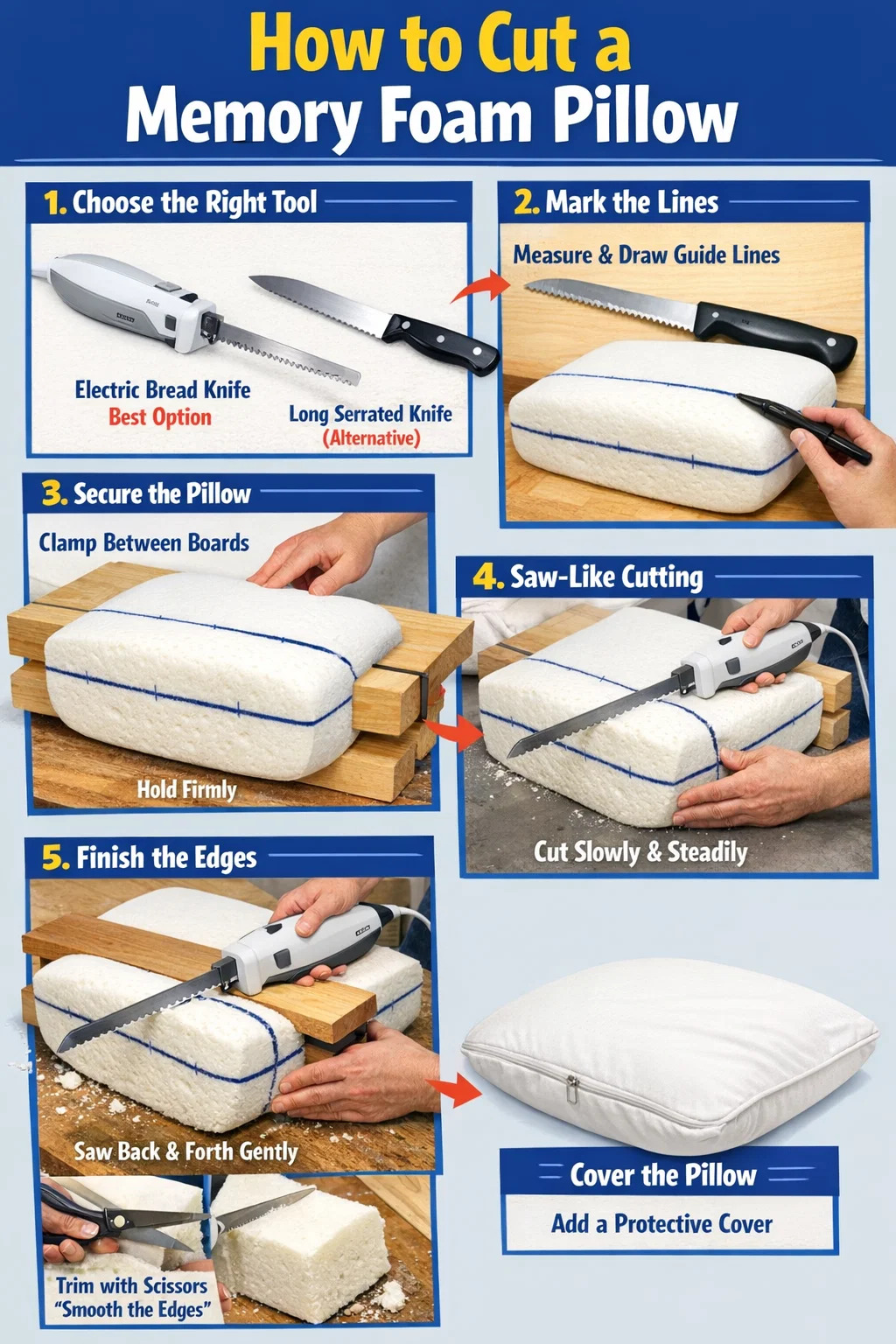 Kadangkala, jika a bantal busa memori terlalu tinggi, atau anda ingin menukarnya menjadi sandaran atau bantal kembara, anda mungkin perlu menggunakan alat pemotong. Oleh kerana busa memori adalah bahan yang sangat keras dan padat, pemotongan secara sembarangan boleh menyebabkan bahagian tepi tidak rata dan beralun.