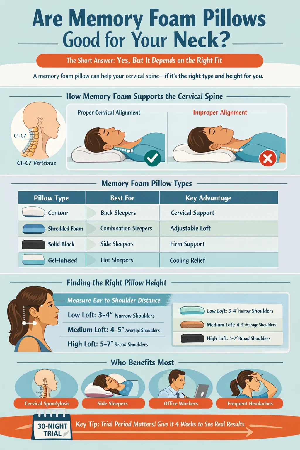 Pilih bantal busa memori yang sesuai untuk kedudukan tidur dan lebar bahu anda, berikannya percubaan selama 4 minggu yang tulen, dan nilai keputusan dengan jujur. Bagi kebanyakan orang, perubahan tunggal ini menghasilkan peningkatan yang boleh diukur dan berkekalan dalam kesihatan serviks dan kualiti tidur keseluruhan.