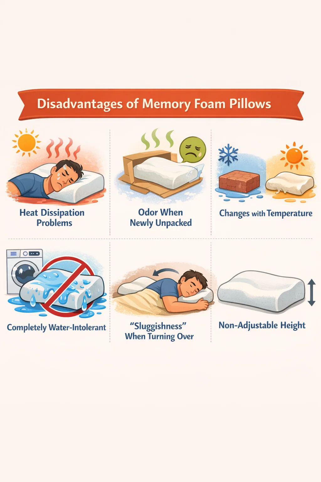Walaupun bantal busa memori terkenal dengan keselesaan dan sokongan leher mereka, mereka tidak sempurna. Untuk tabiat tidur setiap individu, bantal ini mempunyai beberapa kelemahan yang menjengkelkan.