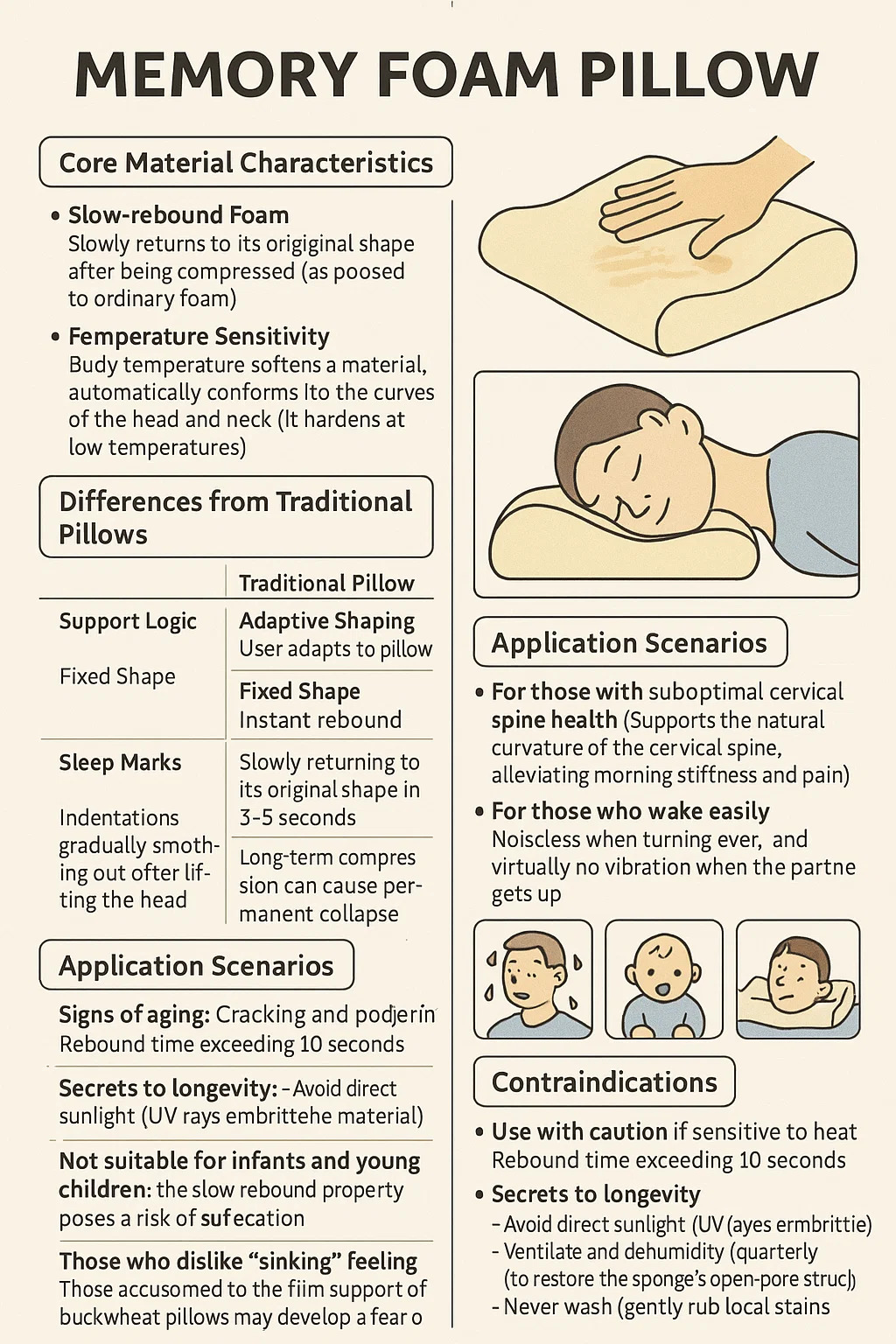 | Ciri | Bantal buih memori | Bantal tradisional (polyfill / down) |