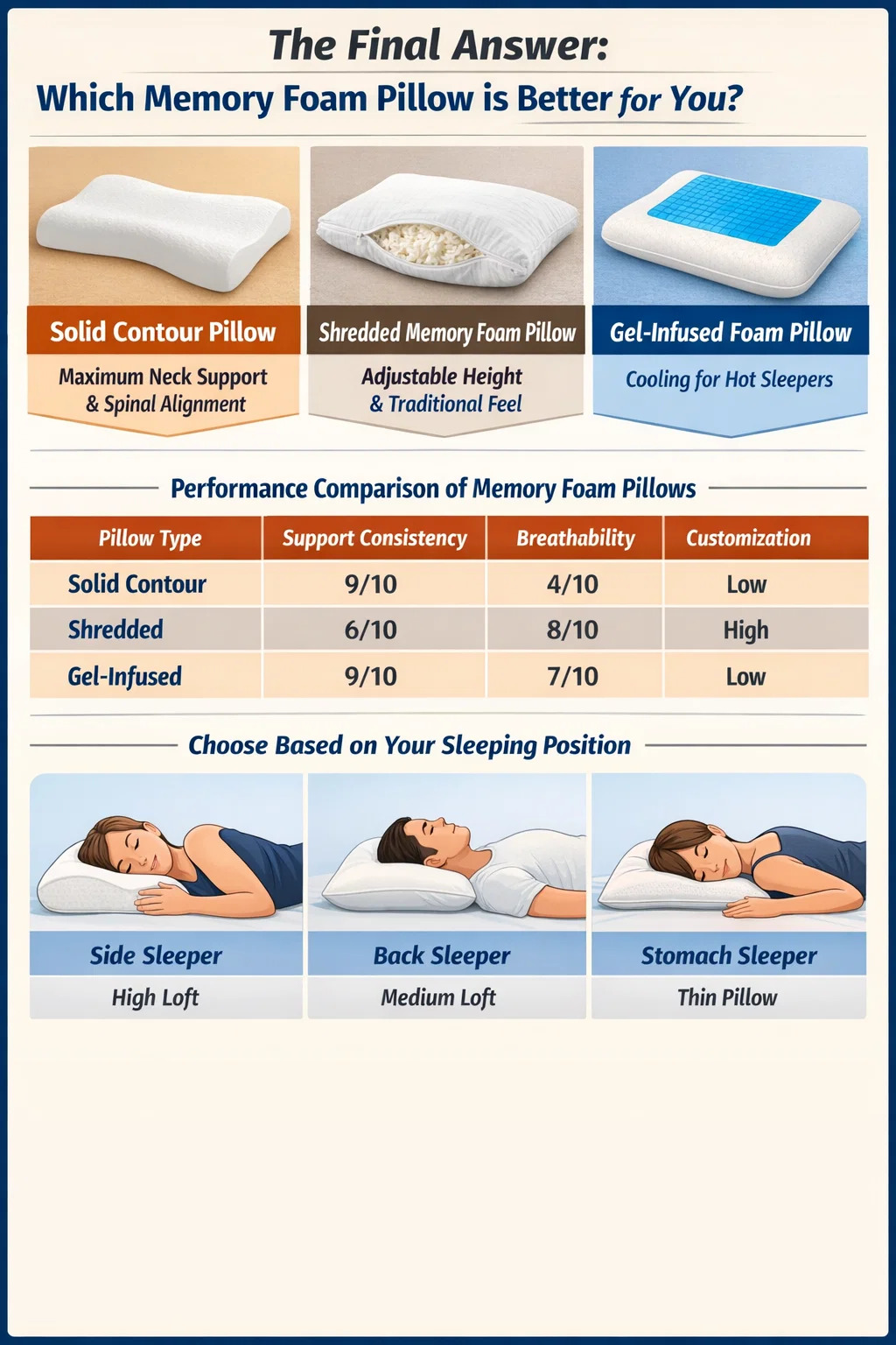 Tiada bantal "terbaik", tetapi terdapat pemenang yang jelas berdasarkan tabiat tidur khusus anda. Jika anda mengutamakan sokongan leher maksimum dan penjajaran tulang belakang, a bantal busa memori kontur pepejal adalah unggul. Jika anda lebih suka rasa tradisional dengan keupayaan untuk menyesuaikan ketinggian, a bantal busa memori yang dicincang adalah pilihan yang lebih baik. Bagi mereka yang kerap bangun berpeluh, a bantal buih memori yang diselitkan gel atau sel terbuka adalah satu-satunya pilihan yang berdaya maju untuk mengelakkan terlalu panas.